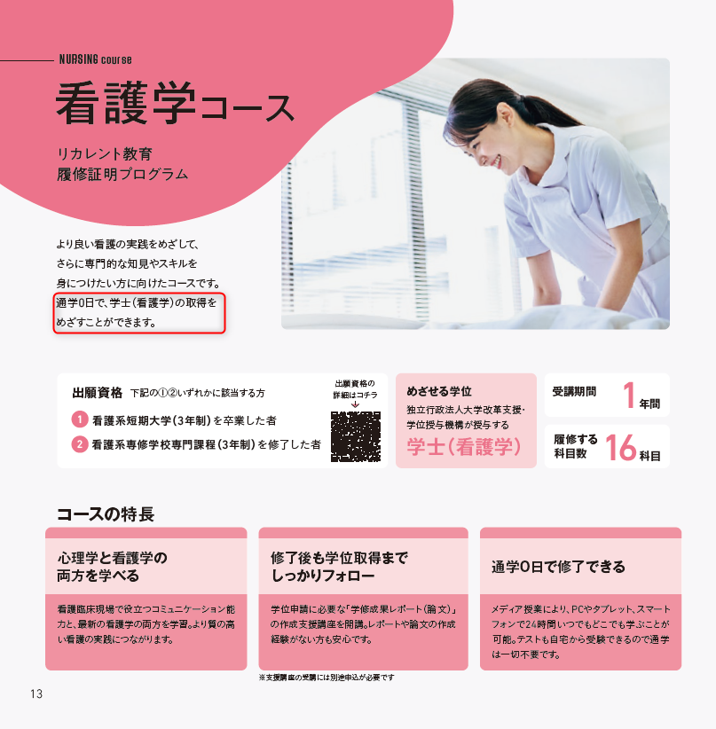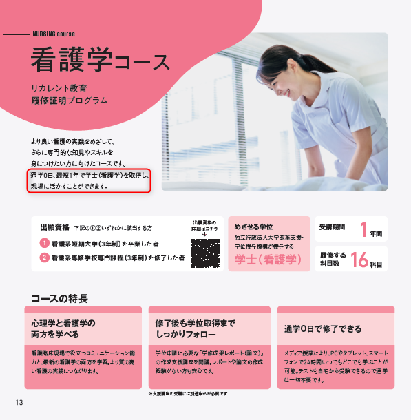 看護学コースは最短1年で修了し、コース修了後に大学改革支援・学位授与機構への申請と同機構の審査を経て学位授与となります。そのため、1年で学士(看護学)の取得までが可能かのような上記の【訂正前】の記載は誤りであり、【訂正後】の内容に訂正をさせていただきます。